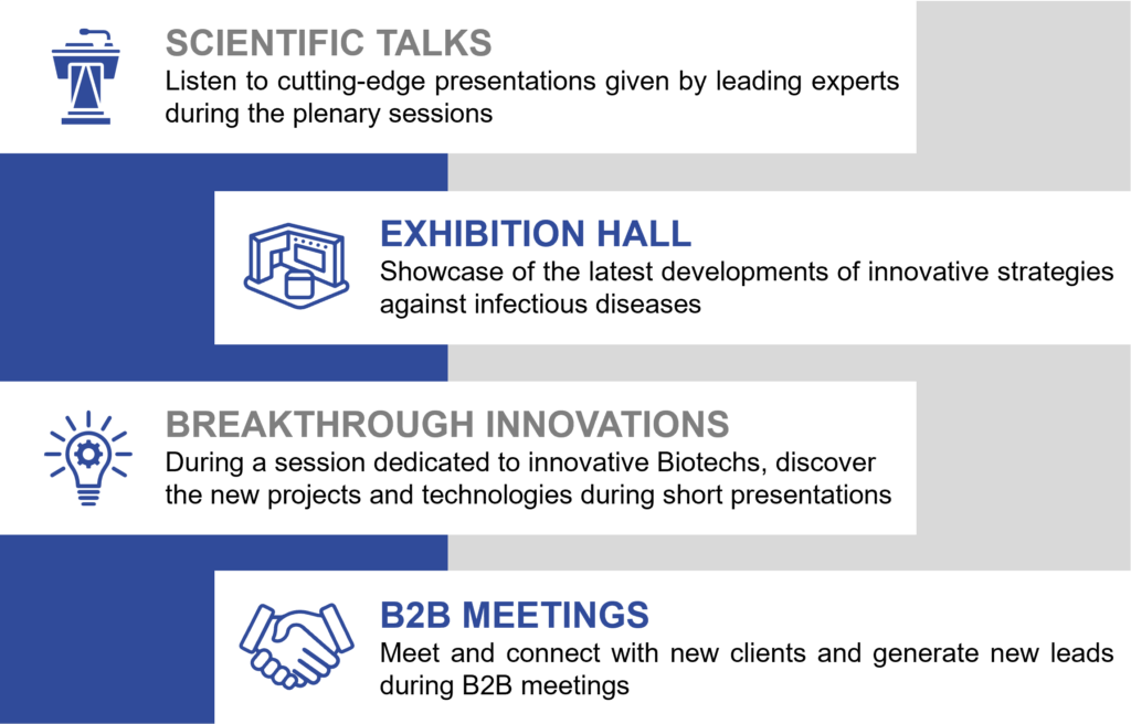The purpose of this two-day congress is to foster interactions between pharmaceutical industries, research labs, service providers, technology developers, and clinicians, thereby contributing to the development of innovative strategies against infectious diseases in a multidisciplinary approach.